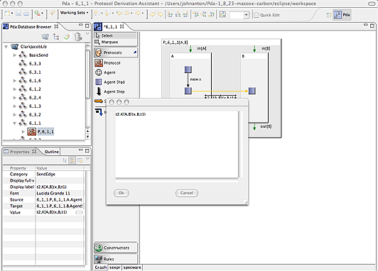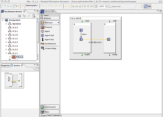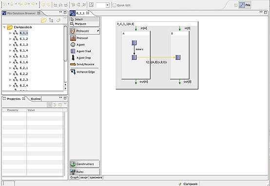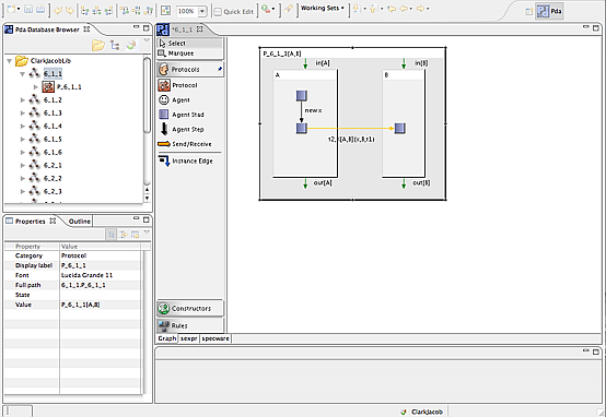 Editing pane Perhaps the region where you will place most of your focus is the Editing pane. In the figure above, you see a simple icon that represents a protocol named P_6_1_1. To its left are mini-toolbar buttons that operate within the context of the Protocol editor: Select, Marquee, Protocols (expanded in the figure), Constructors, and Rules. Below the main editor window are two tabs (Graph, sexpr): these control what is displayed in the Editing pane. Graph is the default selection; it shows the derivation graph depicted in a agent-arrows format, while sexpr shows a lisp-like representation for the flow of actions in the protocol under edit. See the Tips for Use Section for more information on sexpr.